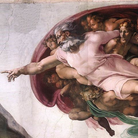 Konačno, i sam Bog zastaje da dodirom podari Adamu ono najdragocenije na Stvaranju Adama: oko Boga je punoća, oko čoveka je praznina.[9] Mikelanđelo kao da je suspendovao vreme na svojim skulpturama i freskama locirajući ga pre mita, pre religije, čak i pre same egzistencije.